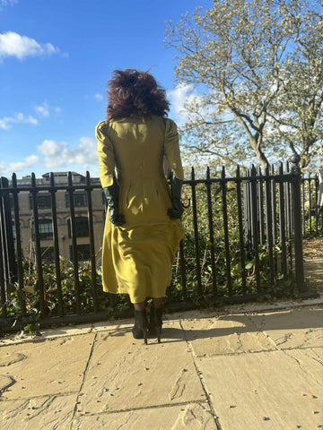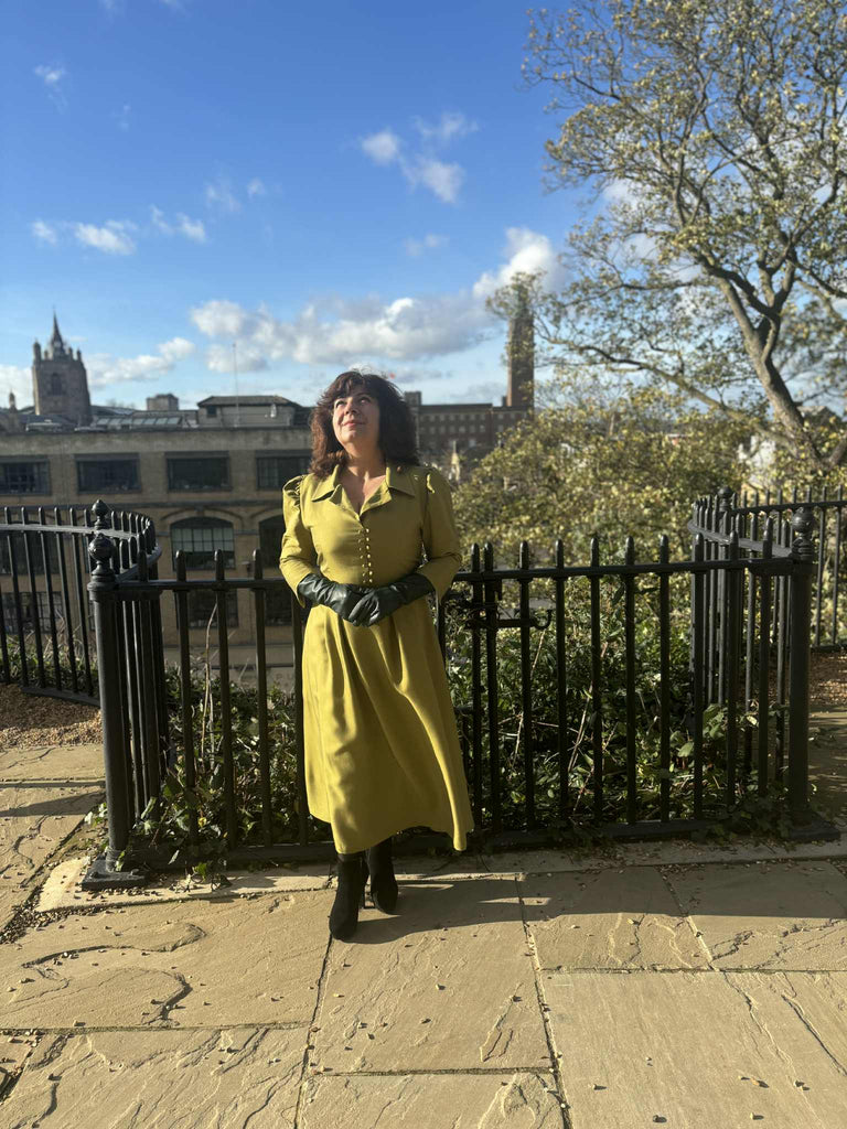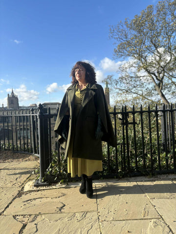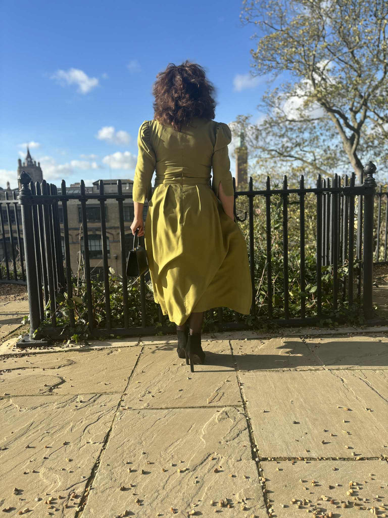 The Constance Dress offers the tailored sophistication of a classic coat with the soft comfort of a dress. Crafted from heavyweight 100% cotton in a rich olive shade, this piece features a structured coat-style collar, gently puffed three-quarter sleeves, and a front row of fabric-covered buttons for a refined, heritage-inspired look.