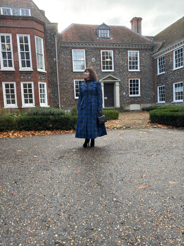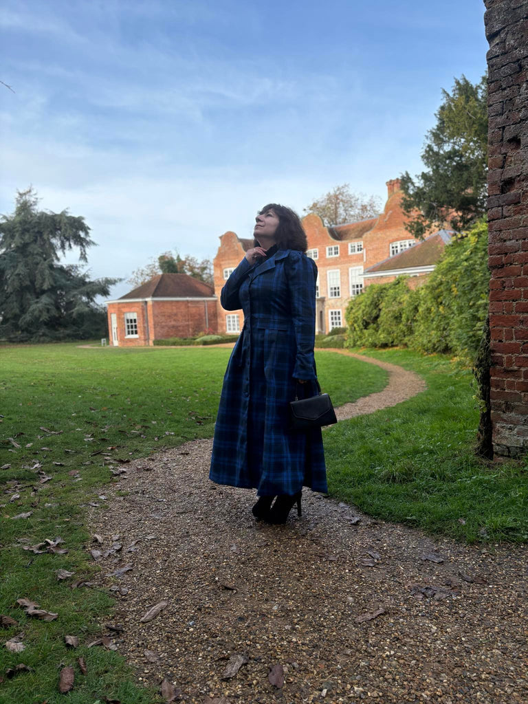 The Cora Coat brings together the tailored elegance of a coat with the comfort and ease of a dress. Designed to be worn either way, this versatile midi-length garment is crafted from heavyweight Waterproof Luxury Tartan in rich tones of royal and dark blue.